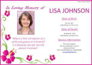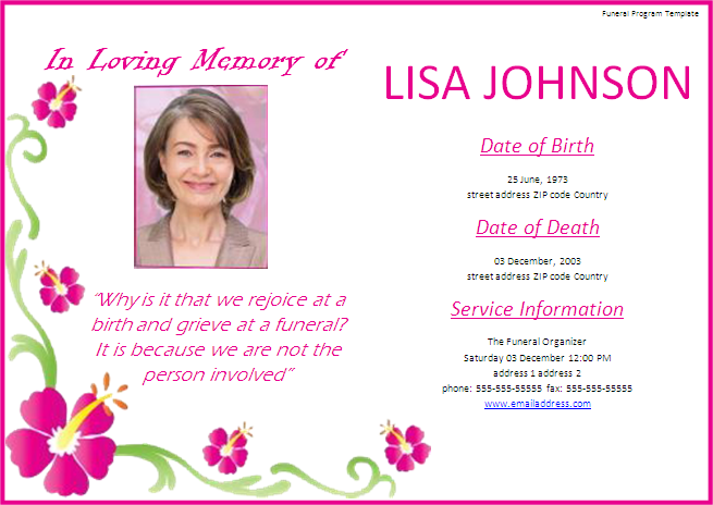 Death is a truth which can never be falsified and will of God is always done. Families of the late persons gather and pray for the late person. This gathering is known as funeral program and format used for this event is called Funeral program template. It is true that everyone gets grieved when anyone close to them dies but no one can change the truth. Special invitation for the funeral program is designed and distributed among the relatives and close friends. This funeral program template includes picture of the late person, his/her name, date of death, number of years he lived, a poem for the late person, worship time etc.