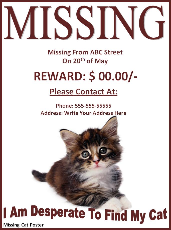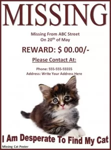 It is really depression if someone gets his pet missing. In this time of depression, you should not lose hope but try to get your pet back. You can do different things to get information about your pet. Missing pet poster template is one of these effective tools. Make a missing pet poster with your pet’s recent picture in the center. Preparing a missing pet poster is very easy. You need to have a clear picture of your pet and note some important points about your pet that can help people in recognizing your pet. These points may include your pet name, its color, and the place where it was seen for the last time, the special sound that makes your pet attentive etc. Don’t forget to announce prize for the person who will bring your pet to you.