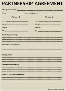 Partnership agreement template is a legal document just like a partnership deed which contains information about the partnership business like names of partners, firm name, starting date, partnership capital and ratio of the capital shared by each partner, clauses about sharing the profits and losses of the business, information about who will manage the business, information about admission of new partners, rules for withdrawals, business addresses, addresses of all partners, calculation of goodwill and so on. This document should describe every bit of the business in detail to prevent future disputes among the partners. A partnership agreement should be drafted considering its legal importance. A person having knowledge of law should draft this document. A sample partnership agreement can help the writer in drafting professional document.