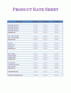 A rate sheet template is a list of prices of goods or services offered for sale. This list may be used at a departmental store or by wholesalers for their customers. This list will include list of names of products, quantity of the products, unit price and package price of each product etc. Other content on this sheet will include information about the business like business name, address line, business phone and fax, website and business logo. It may be printed on a simple white paper or on colored paper depending on the nature of the business.