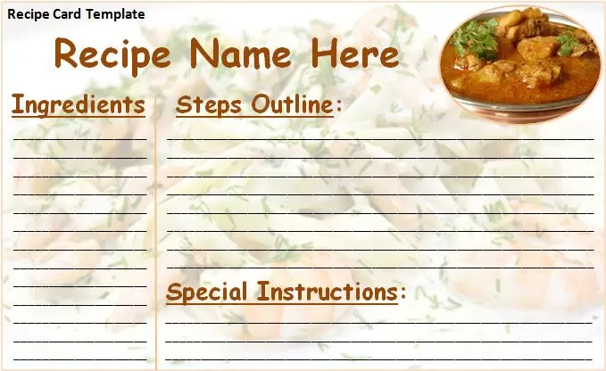 A recipe card template, as its name shows, is a card with a recipe on it. This card can be used for different purposes, like advertising, and making a recipe book. A recipe card may be used for making a personal recipe book or a recipe card may be offered with servings in the restaurant for advertisement. This card includes an image of the dished out recipe, a list of ingredients, and steps to follow for cooking. A recipe card may be printed on a blank page or with a cooking-related background. Moreover, designing a recipe card is a very easy task. You need to have a picture to add on the card, list all the ingredients with quantities and give a procedure to be followed. A recipe card template can make it easier for you to design a recipe card for yourself.