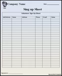 A signup sheet template is a list which includes names of people who have been or are to be volunteered for any specific job or activity. Following information about each individual will be included in the list: