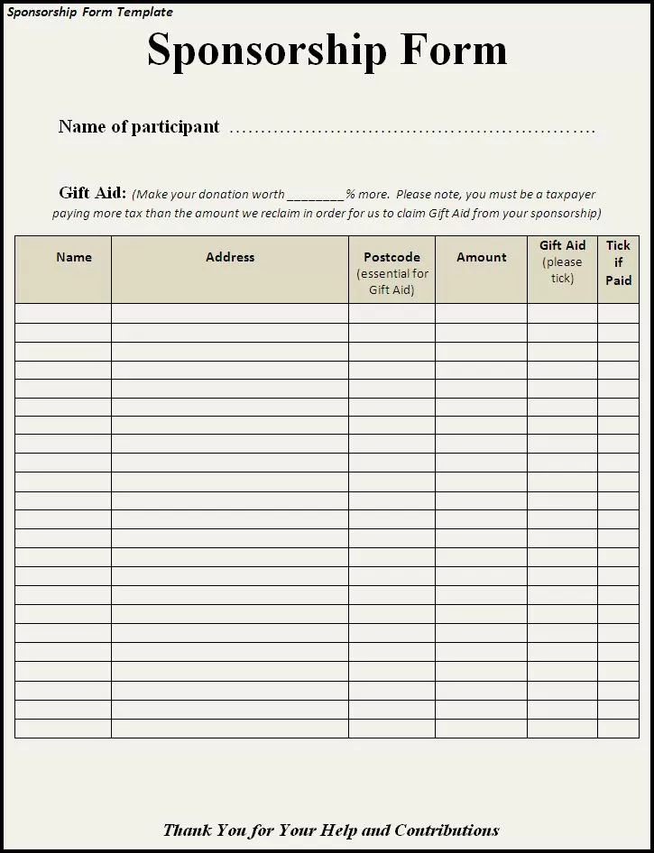 A sponsorship form template is used to record information about fundraising for any project. It includes information about the project to be sponsored, names of key participants of the project with the addresses and contact details, amount contributed by a person, gift aid by each person with a checkbox in front of each name to mention that the amount has been paid etc. This sponsorship form is drafted as a simple form and is signed by the concerned people once it is completed. However, the user must ensure the accuracy of this form because any mistake may cause rejection of sponsorship. Moreover, don’t forget to re-check it once again before sending it.
