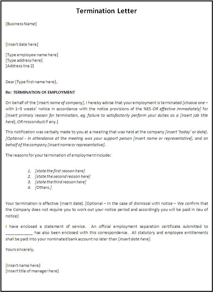 A termination letter template is opposite to the resignation letter. It is forwarded by the employer to employee when he is being terminated from his job. A termination letter may also be written when a contract or any business deal is to be terminated before decided time. Content of the termination letter will be written as per the reason. Like any business letter, this letter must be written clearly and concisely and the subject person should be addressed properly. Make sure to write a wish for future if it is a job termination letter to make this letter less painful and disappointing for the employee. Close this letter properly and check its perfection before you send it. A part from this, we are also providing our services of developing new templates on order. In this section, you will send us your requirements and title to our technical staff. After setting down all matters, they will deliver you the order word template on very economical rate. For more information and help, you can visit our Help Page.