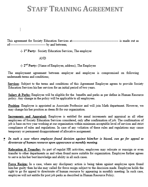 A training agreement template is a legal document that specifies the nature of your internship you are having or will going to have. The training agreement is signed between your educational institute or the company in which you are going to have the internship. Other than this, a training agreement is a legal document that elaborates how a legal firm will provide training to the staff of the company or the bunch of students? How a company will provide them trainers who can provide them training? The agreement for training template contain the starting time of the agreements there is no restriction for staring the training agreement it can start at any time of the year. The agreement contain the predicted time the training will proceed. The number of exam attempts your employer will support the trainer to attempt. The training agreement contains all the important information about the training, what kind of courses will be offered in the training.